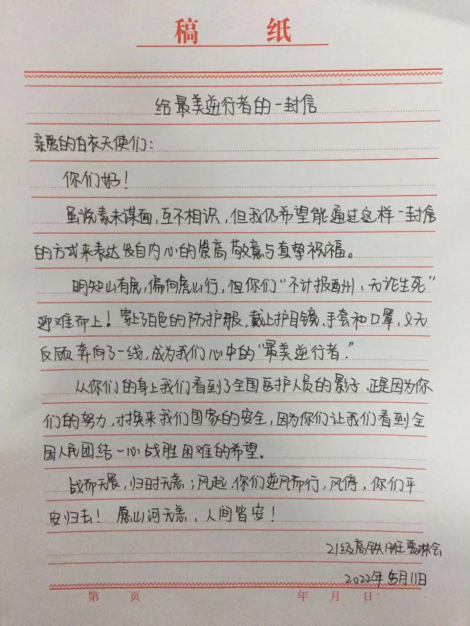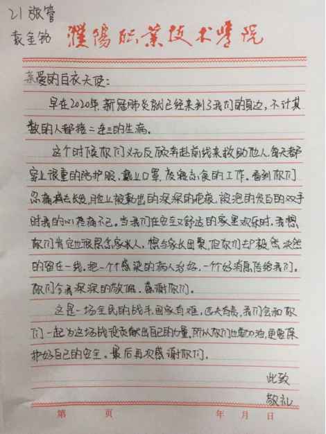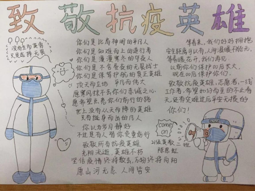 自2020年疫情爆發(fā)至今,許多白衣戰(zhàn)士奮戰(zhàn)一線,守護大家平安,同學(xué)們在網(wǎng)絡(luò)上得知他們的消息,在網(wǎng)絡(luò)上為他們加油,居家抗疫成了大家的責(zé)任,大家感謝白衣天使的付出。今年疫情卷土重來,依舊是白衣天使們奮戰(zhàn)前線,我們是學(xué)生,為此同學(xué)們用大家最得力的“助手”----紙、筆,對他們表示感謝。征文、感謝信、繪畫一幅幅作品都是同學(xué)們對白衣天使的真切感謝,感謝他們不畏艱苦奮戰(zhàn)一線,感謝他們默默無聞堅守一線,真摯的話語無不令人感動,優(yōu)美的線條無不展現(xiàn)白衣天使的魅力。