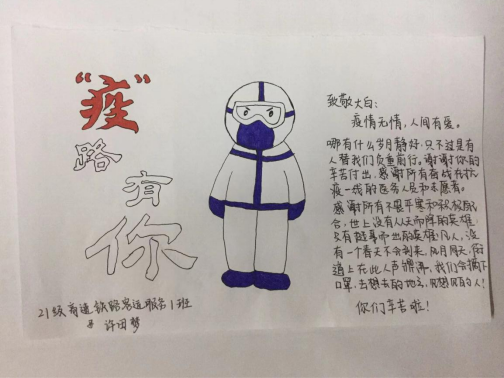 疫情當前,人人都是防疫小能手,但卻總有“白衣天使”在前方奮戰(zhàn),為體現(xiàn)同學(xué)們對“白衣天使”的感恩之情,惟楚高鐵班學(xué)生開展感恩“白衣天使”系列活動。
